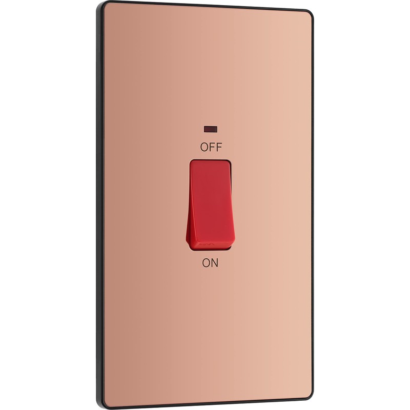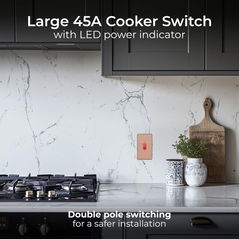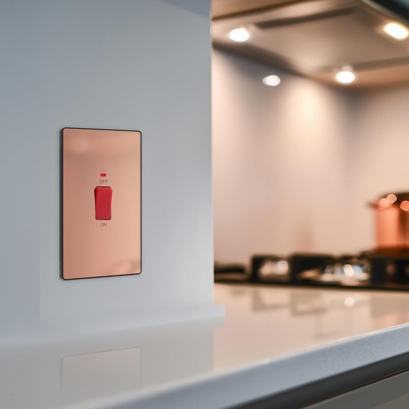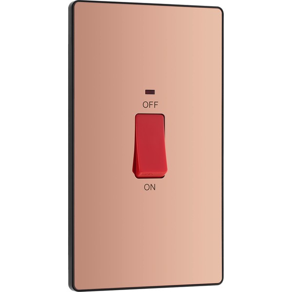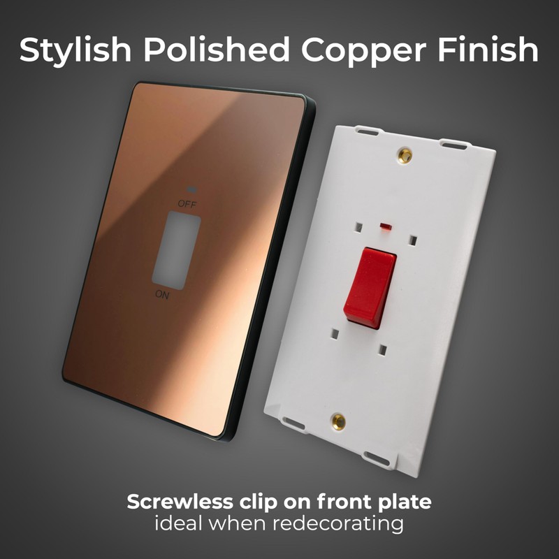 - SLIM AND CONTEMPORARY LARGE COOKER SWITCH WITH LED INDICATOR: From BG Electrical, the Evolve polished copper large 45A cooker switch is ideal for modern interiors. With its screwless removeable clip on/off front, it's ideal for redecoration
