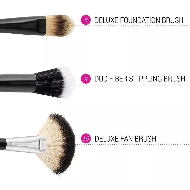 Set de 3 brochas básicas para rostro. Incluye 1 brocha para aplicar base en crema o líquida,  1 Brocha en forma de abanico para aplicar productos de contorno en crema o polvo y 1 Brocha dobre fibra que será tu aliada con rubores e iluminadores. La suavidad de cada una te sorprenderá.