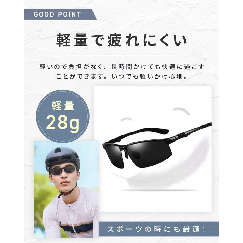 - 材質:軽量Al-Mg、重さ:約28g、レンズ:UVカット、調光/偏光