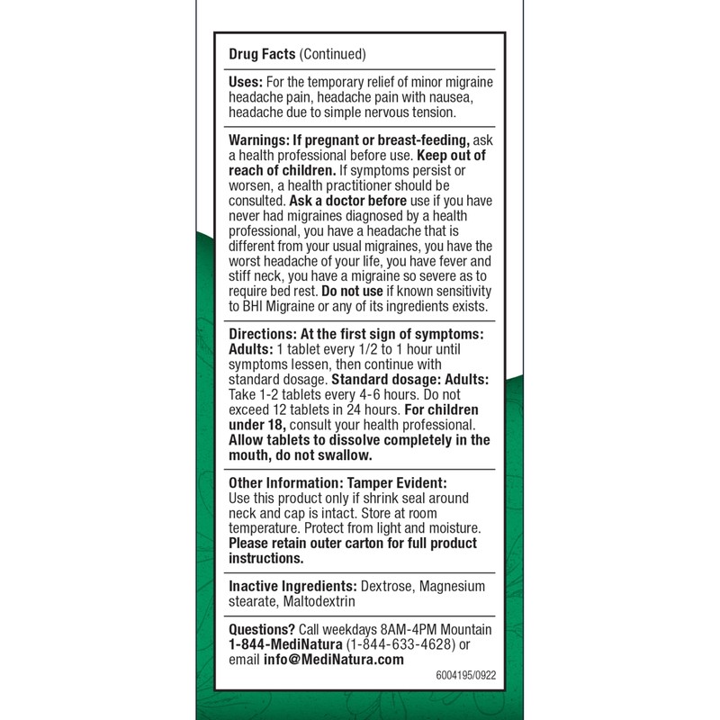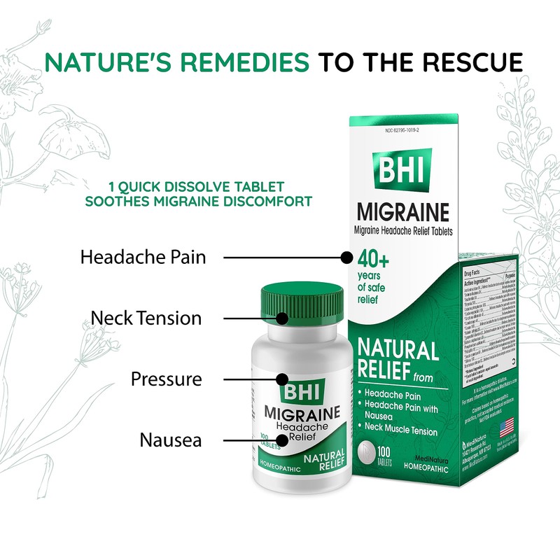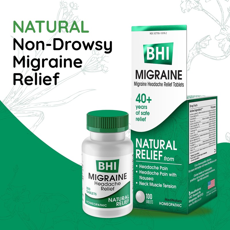BHI Migraine Natural Headache & Migraine Relief 17 Powerful Multi-Symptom Homeopathic Active Ingredients - Non-Drowsy Remedy Helps Relieve Pain, Tension & Throbbing in Head, Eyes & Neck - 100 Tablets