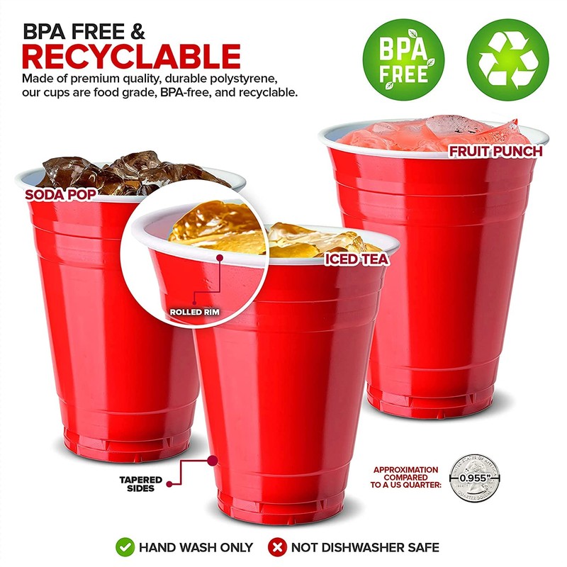 - BPA-Free & Recyclable Red Party Cups: Get the party started with our vibrant red plastic cups, 12-ounce plastic cups! Made of premium quality, durable polystyrene, our solo plastic cups are food grade, BPA-free, and recyclable. Designed with a rolled rim, our cups have no sharp edges and are rigid enough to maintain its shape. The tapered sides make our disposable red cups a comfortable fit in your hand. Great for soda pop, fruit juice, punch, ice tea, lemonade, sparkling cider, beer, and more!