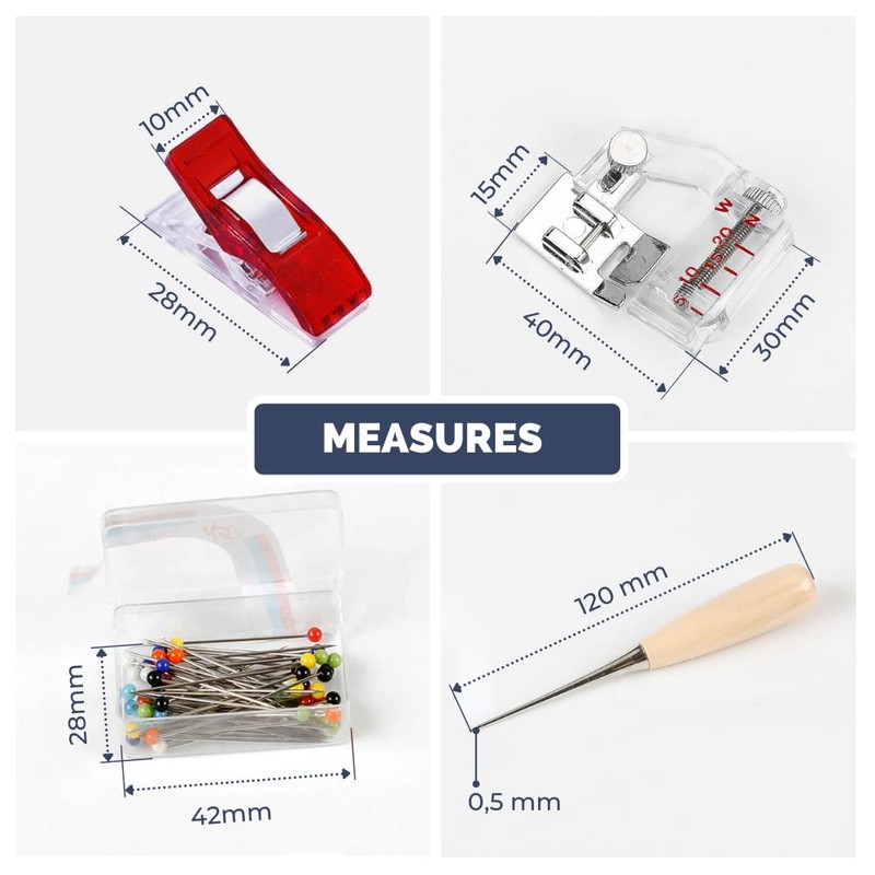 - EXCELLENT KIT: This is a 11 in 1 set, consisting of 4 bias tape funnels in different sizes (6mm, 12mm, 18mm and 25mm), 4 fabric clips, 1 sewing awl, 1 box of 50 32mm ball needles and an adjustable bias binding foot, which can meet your needs. o