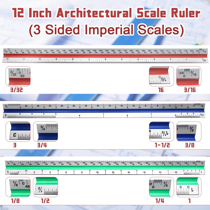 - Versatile scale options: Equipped with 3 sides and 6 different imperial scales (the standard imperial measurements included 1-1/2, 1, 3/4, 3/8, 3/16, 3/32, 1/2, 1/4, 1/8, 3, 16), it can meet your different usage needs