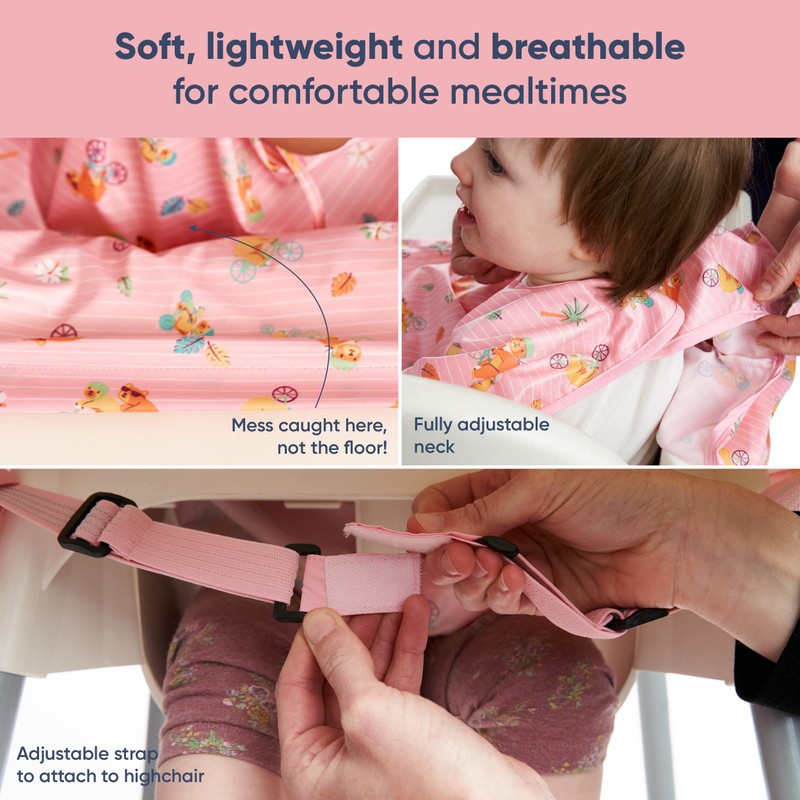 - Convenient, Adjustable Sleeved Bib - Our adjustable toddler bib fits any highchair perfectly, with or without trays. Simply attach your versatile high chair bib to prams and tables to keep your child neat, clean, and dry when eating.
