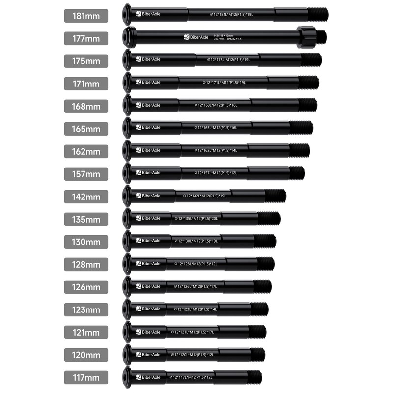 - Size of the thru axles: 117 mm / 120 mm / 121 mm / 123 mm / 126 mm / 128 mm / 130 mm / 135 mm / 142 mm / 157 mm / 162 mm / 165 mm / 168 mm / 171 mm / 175 mm / 177 mm / 181 mm.