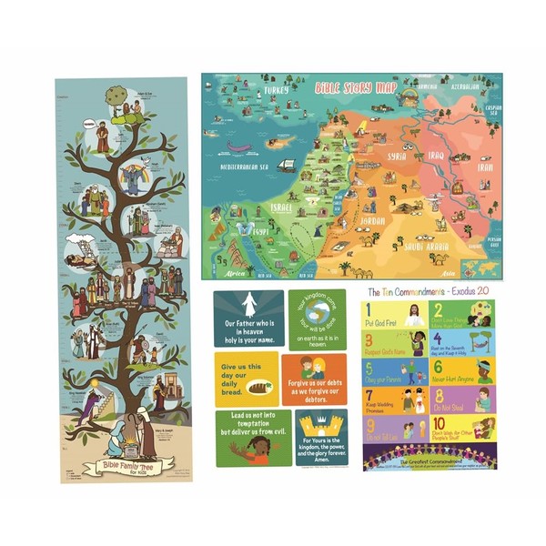 Bible Posters for Kids (Set of 4) – Educational & Inspirational Includes The Lord’s Prayer, Ten Commandments, Bible Story Map, & Family Tree Timeline