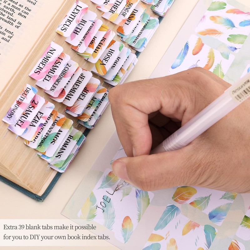 - 105 Peel-and-Stick Large Print Labels: 66pcs Bible tabs effortlessly organize every book of the Bible with bold, easy-to-read tabs designed to withstand frequent use while enhancing navigation. 39pcs extra blank tabs makes it possible to DIY your own index tabs.