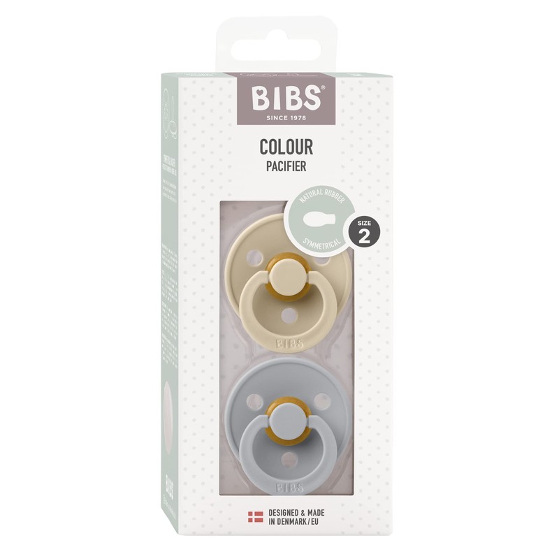 BIBS Colour Soothers Pack of 2, BPA-Free, Symmetrical Teat. Natural Rubber/Latex, Made in Denmark. 6-18 Months (Pack of 2), Cloud & Vanilla
