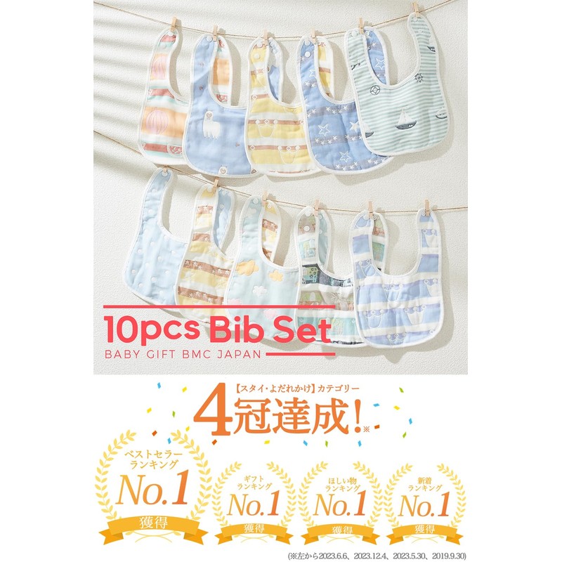 Bibs Set of 10, Bibs, 100% Cotton, Soft, 6 Layers, Gauze, U-Shape, blue