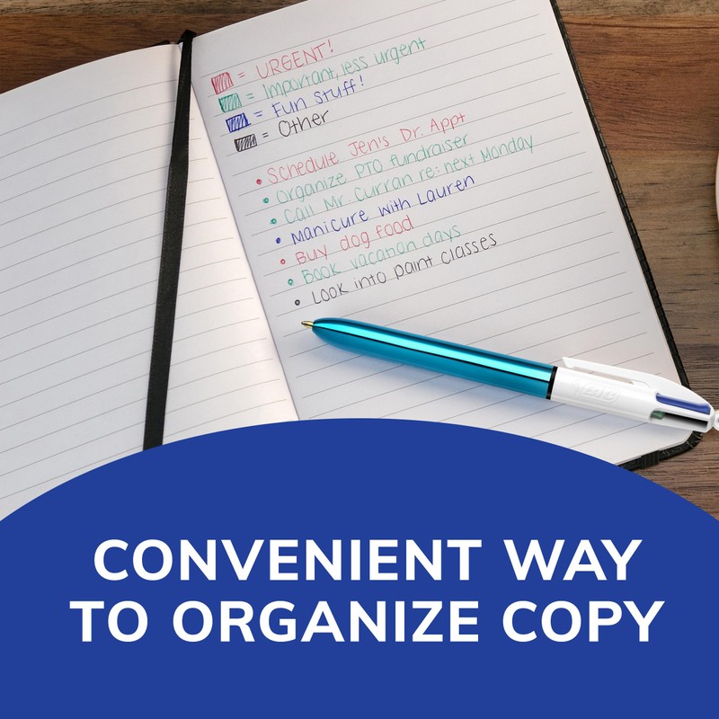 - Estos bolígrafos BIC cuentan con cuatro colores en un práctico bolígrafo: negro, azul, rojo y verde