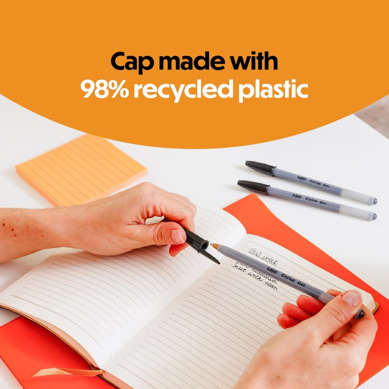 - A box of eight black longest-lasting* gel pens with a 98% recycled plastic cap *based on average mileage of blue, black, red, and green