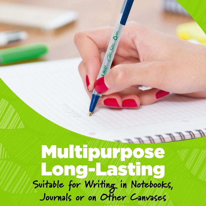Help write our planet’s future with the long-lasting BIC Ecolutions Clic Stic Retractable Ballpoint Pens. This ball pen is not only made from 78% recycled plastic *excluding ink cartridge, but the paperboard used in the packaging is made up of 100% recycled content and is also recyclable. With a medium 1.0 mm ballpoint, it’s the perfect BIC pen for everyday writing in journals, notebooks or sticky notes. The smooth writing ink system delivers hours of effortless writing in black ink. Plus, a classic, slender, semi-clear barrel acts as a handy window when checking pen ink levels. Use the convenient clip to hook the black ink pens onto your pocket or notebook. Designed for convenience, these retractable pens let you start writing with just one click. Looking for larger quantities of eco-friendly office or school supplies Each pack contains 48 black BIC Ecolutions Clic Stic Ballpoint Pens for a high-quality, affordable writing utensil you can trust.