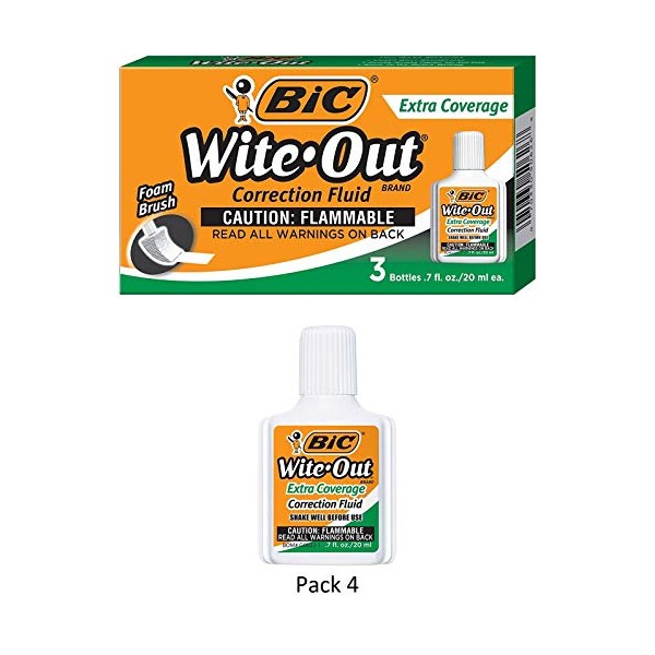 BIC Wite-Out Brand Extra Coverage Correction Fluid, 20 ml, White, 3-Count, 4 ...