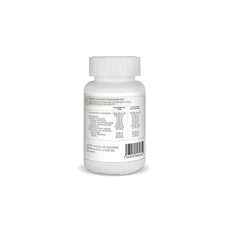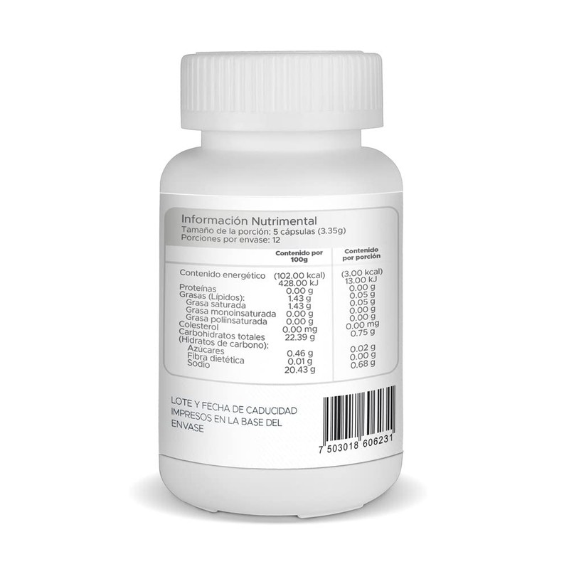 - 1 cápsula de 1000mg aporta 12 mEq o mmol de bicarbonato de sodio y 1 cápsula de 500 mg aporta 6 mEq o mmol de bicarbonato de sodio