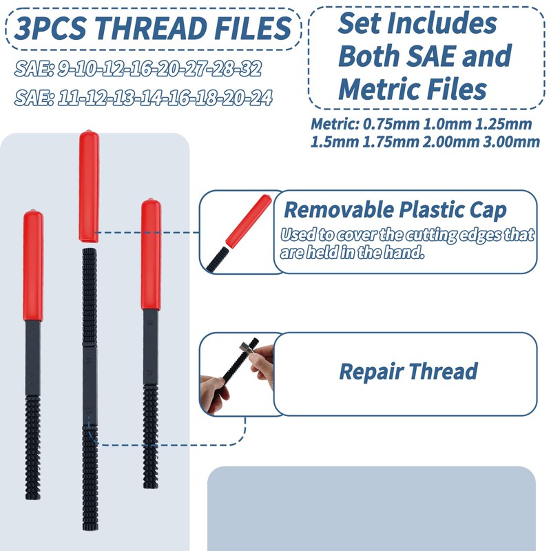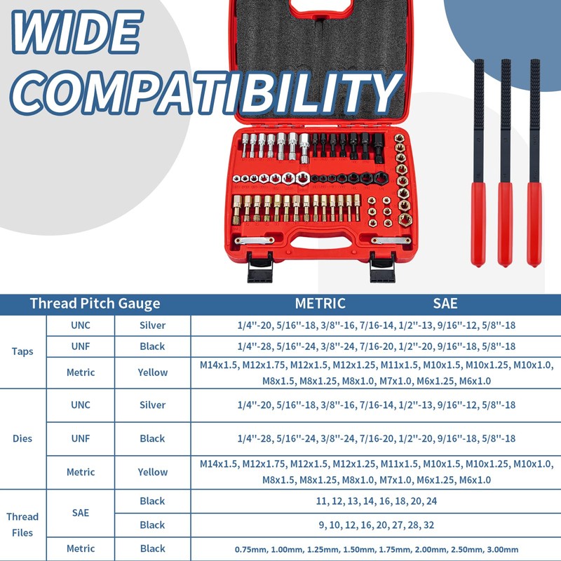 - Our Bicos 61-piece thread chaser set includes 28 taps, 28 dies, and 3 thread files in metric and 2 x thread pitch gauges. This comprehensive assortment addresses a variety of threading needs, covering popular UNC, UNF, and metric dimensions. UNC(Silver):5/8“-11, 9/16“-12, 1/2“-13, 7/16“-14, 3/8“-16, 5/16“-18, 1/4“-20;UNF(Black):5/8“-18, 9/16“-18, 1/2“-20, 7/16“-20, 3/8“-24, 5/16“-24, 1/4“-28;Metric(Yellow):M14x1.5, M12x1.75, M12x1.5, M12x1.25, M11x1.5, M10x1.5, M10x1.25, M10x1.0, M8x1.5, M8x1.25, M8x1.0, M7x1.0, M6x1.25,M6x1.0. making it suitable for diverse applications.