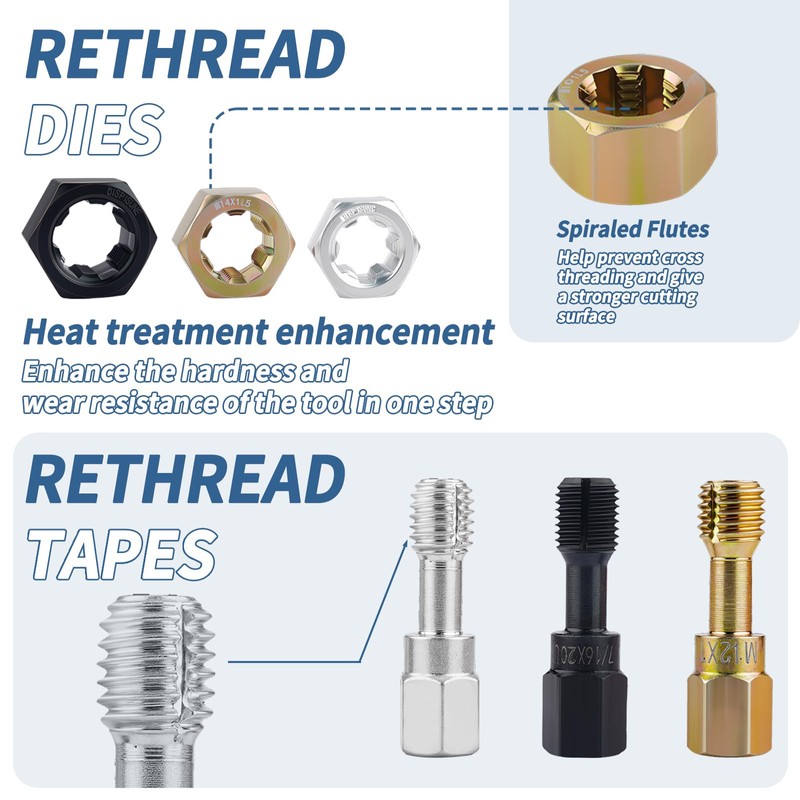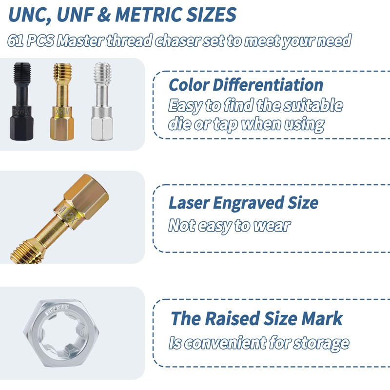 - Organized in a practical storage case, the Bicos master thread chaser set promotes easy organization. The color-coded dies and taps simplify identification, with silver for UNC sizes, black for UNF sizes, and gold for metric sizes. Each specification is clearly labeled to support quick and straightforward access during use.