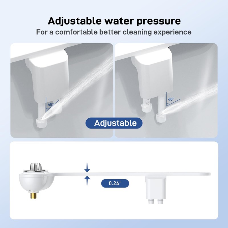 Introducing the Bidet Attachment for Toilet, a non-electric, self-cleaning solution designed to enhance your bathroom experience with superior hygiene and comfort. This dual nozzle bidet offers both feminine and posterior wash options, ensuring thorough and gentle cleansing tailored to your needs. The adjustable water pressure feature allows you to customize the spray intensity for maximum comfort, while the cold water sprayer provides a refreshing clean without the need for electricity or batteries.