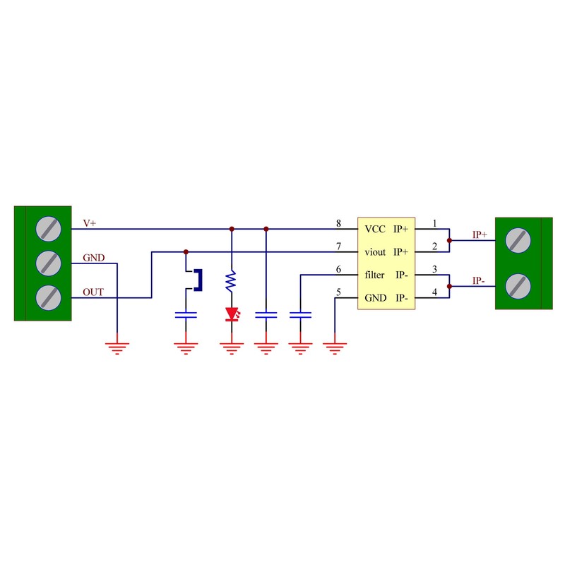 • The red LED is used as an indicator of the operating voltage. The output signal terminal is connected to a 10nF load capacitor via a pin jumper, you can short-circuit or unplug it according to actual needs.