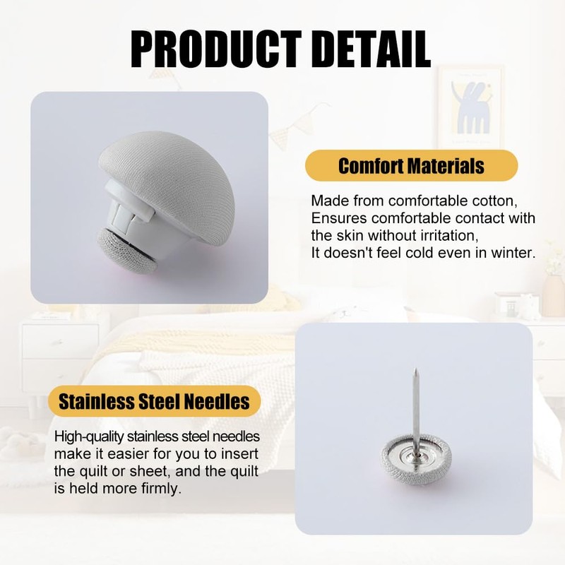 - Easy to use: simply insert the pin through the duvet into the clip at the other end of the round hole, press the button and the duvet is firmly fixed to the bed. If you want to remove the duvet, simply press the button again, and it is easy to release without taking it off. No tools are needed, saving time and effort.