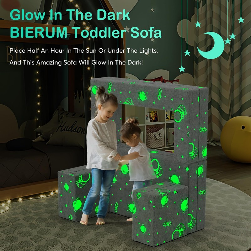 BIERUM Kids Couch, 6PCS Modular Kids Play Couch with Blanket, Kids Sofa Couch with Glow Effects for Playroom & Indoor, Convertible Toddler Couch for Girls and Boys