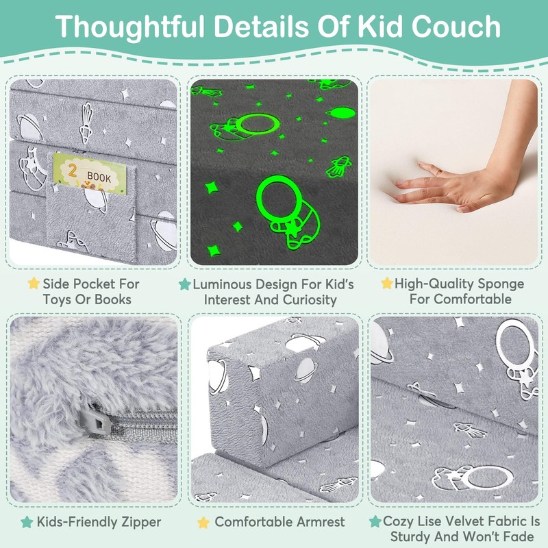 - 【Surprising Nightlight Design】The kids fold out couch features various fun patterns and a unique glow design. Simply expose the sofa to strong light or sunlight for 15-30 minutes during the day, and at night, this toddler sofa will emit a bright shine in the darkness, much to the delight of children. You can enjoy the fun Luminous patterns together with your kid