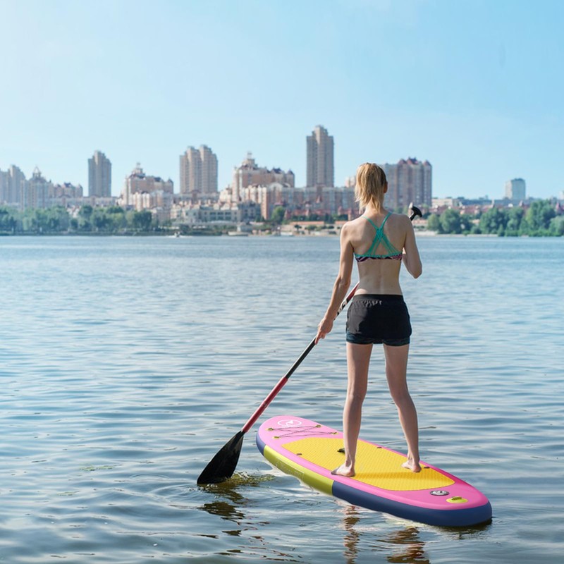 - [Non-slip and soft deck]: This inflatable paddle board is equipped with a non-slip, soft top deck that provides cushioning when you slip. Bringing you a safe surfing experience. Equipped with foot loops to help keep your body firmly anchored to the board and prevent drifting