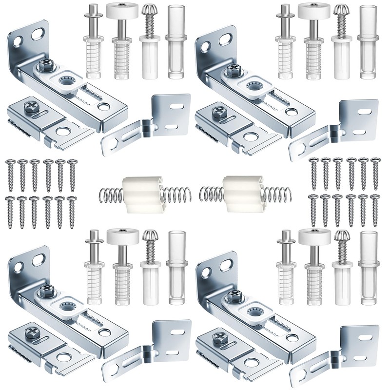 - 【PACKAGE INCLUDE】: 4 Sets Bifold door repair hardware kit includes 4 x 3/8" top metal pivots, 4 x 3/8" top plastic pivots, 4 x 7/8" plastic guide wheels, 4 top pivot brackets, 2 steel spring, 4 door aligner , 4 x 3/8" bottom pivots, 4 x 3/8" bottom pivot brackets, 24 screwss. Closet door hardware kits can quickly and easily repair doors weighing up to 50 lbs. and with thicknesses ranging from 1" to 1-3/8", suitable for 7/8"-1" wide track. (Please note: Track and hinges are not included.)