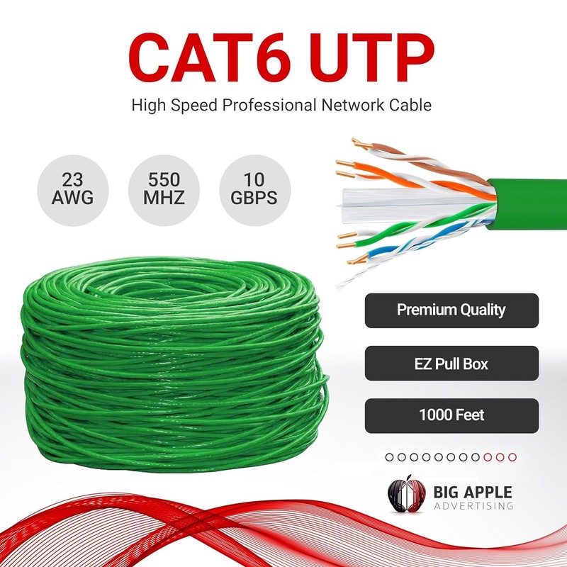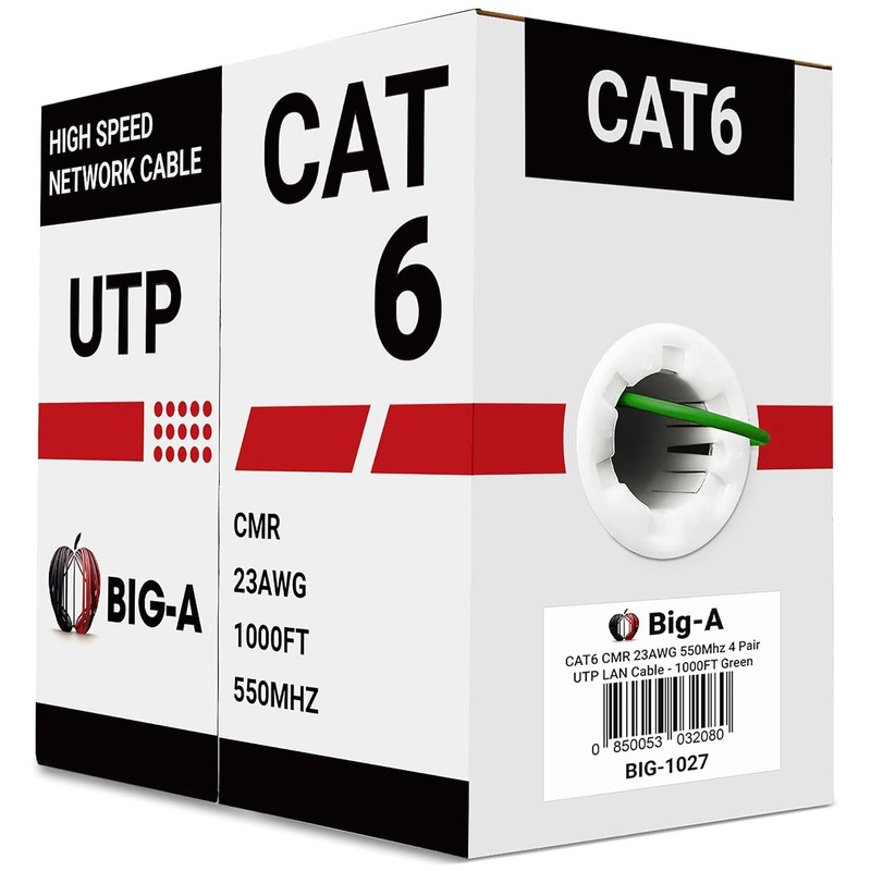 Big-A - Bulk Cat6 Cable 1000ft 23AWG Solid 4 Pair, Cat 6 Ethernet Cable Unshielded Twisted Pair (UTP), (CMR) 550MHz Internet Cable, Pull Box - Green