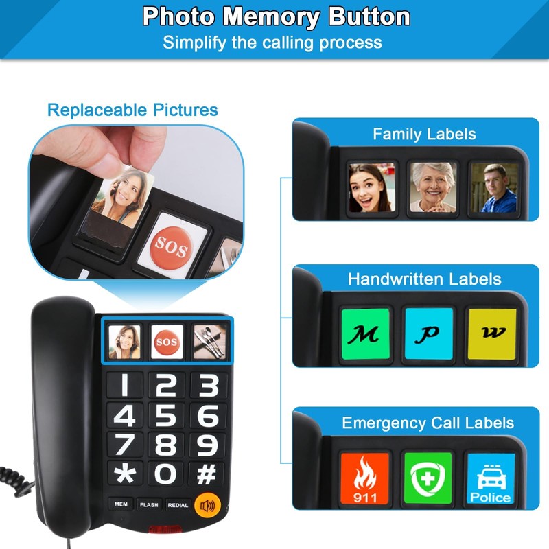 - 【MAKE CALLING EASY】:Specialized phones for seniors make calling and speed dialing effortless. The photo dial feature allows you to attach a photo to each of the 3 frequently dialed phone numbers. These keys are used for a one touch memory without lifting the handset at all just push the key picture memory key and the memory number will be dialed out and the speakerphone will be on automatically. This makes helps seniors with memory loss or visual impairments to identify who they are calling.