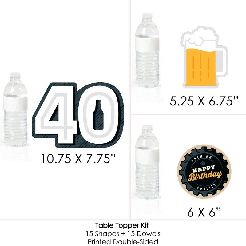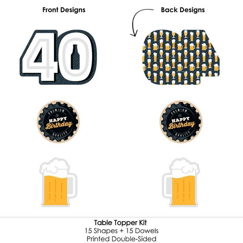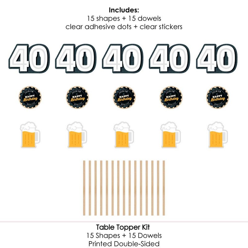 • Cheers and Beers to 40 Years Centerpiece Sticks INCLUDES 15 fortieth party table toppers in three different shapes, 15 wooden dowel sticks and stickers for easy assembly. Beer 40th party table decorations are perfect for a birthday party.