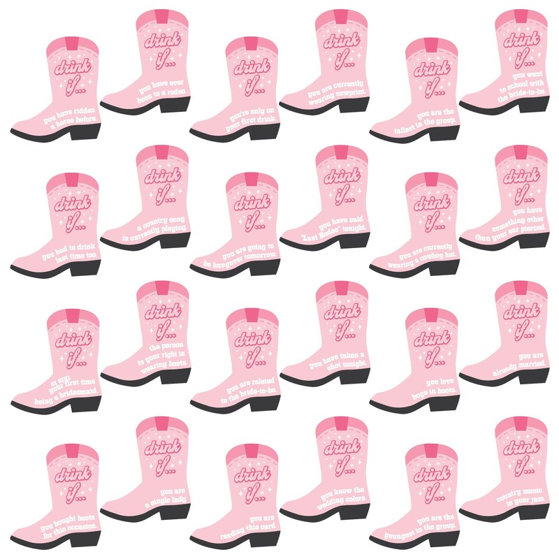 - Last Rodeo Drink If... Las tarjetas de juego incluyen 24 tarjetas en forma de bota con bebida única si... desafíos, perfectas para cualquier despedida de soltera de vaquera rosa.