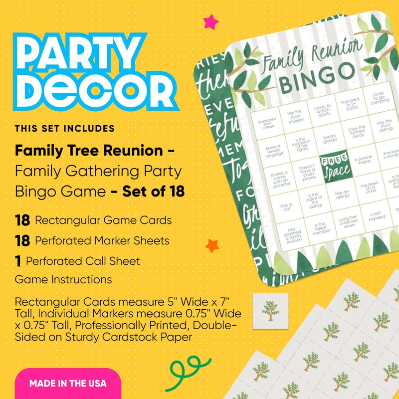- Fabricado en los Estados Unidos: las tarjetas y marcadores de bingo de Family Tree Reunion están diseñados y fabricados en nuestras instalaciones de Wisconsin.