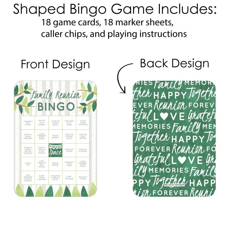 - El bingo Family Tree Reunion incluye 18 tarjetas únicas, 18 hojas perforadas, 2 hojas de llamada perforadas e instrucciones del juego.
