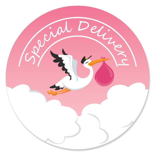 - Girl Special Delivery Circle Sticker Labels INCLUDES 24 round stickers – perfect for styling adorable pink stork baby shower favors, or for sealing invite and thank you envelopes.
