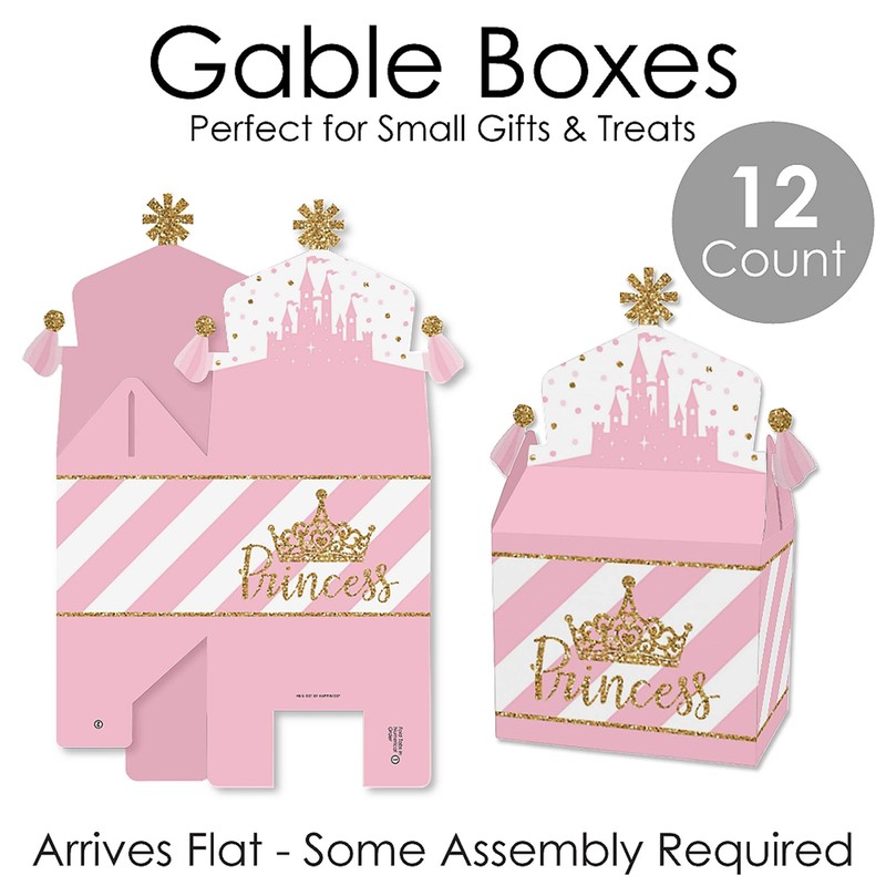 - Gable Boxes INCLUDE: 12 Little Princess Crown-themed goodie party favor boxes. Each box SIZE measures 4.25 inches length x 3 inches width x 7.75 inches height. Gable favor boxes are ideal for small gifts and treats that are under 3.5 inches tall (height for storing items in closed box).
