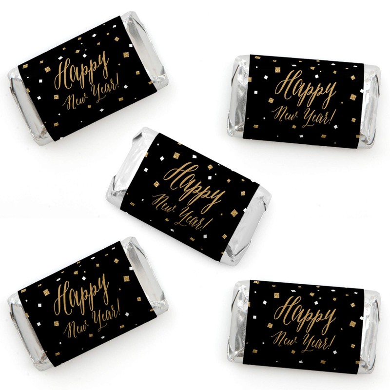 - New Year’s Eve Mini Candy Bar Wrappers INCLUDES 40 candy stickers, perfect for styling an adorable New Year’s Eve candy buffet or unique black and gold New Years Eve Party favors.