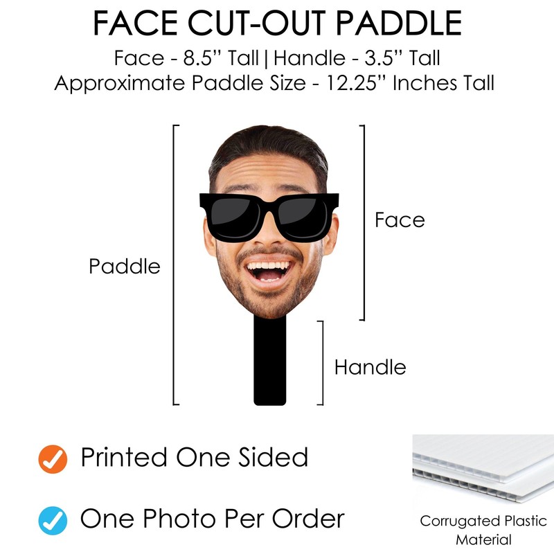 - HIGH-QUALITY PARTY SUPPLY: Custom Photo Head Cut Out paddle is professionally created with single-side print on durable, corrugated plastic. Back side of the face cut-out will be white. Face cut-out paddle is waterproof and can be used outdoors as well as inside. With proper care, the fan face can be used at multiple events.