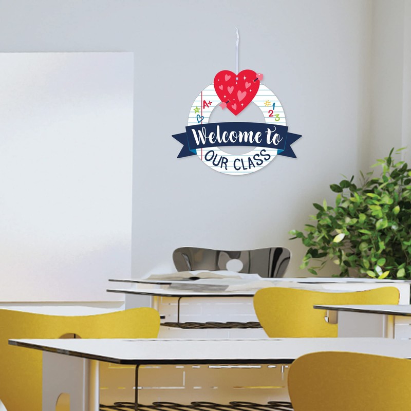 - Easy Assembly: Welcome to our Class Wreath requires some easy assembly. String ribbon through top piece and base piece, pulling ribbon through to secure pieces together. Tie ribbon ends and hang. Holes are pre-cut for your convenience.