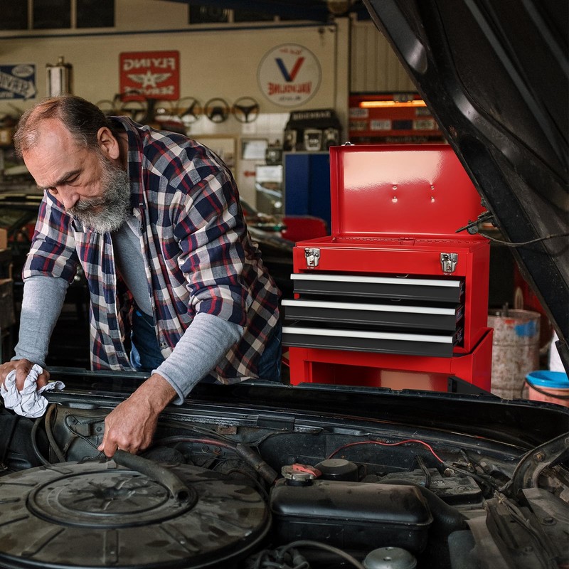 - Top tool chest features three pull out drawers fitted with slide rails, allowing for smooth operation; Bottom storage cabinet features an adjustable shelf and is lockable to keep your tools protected