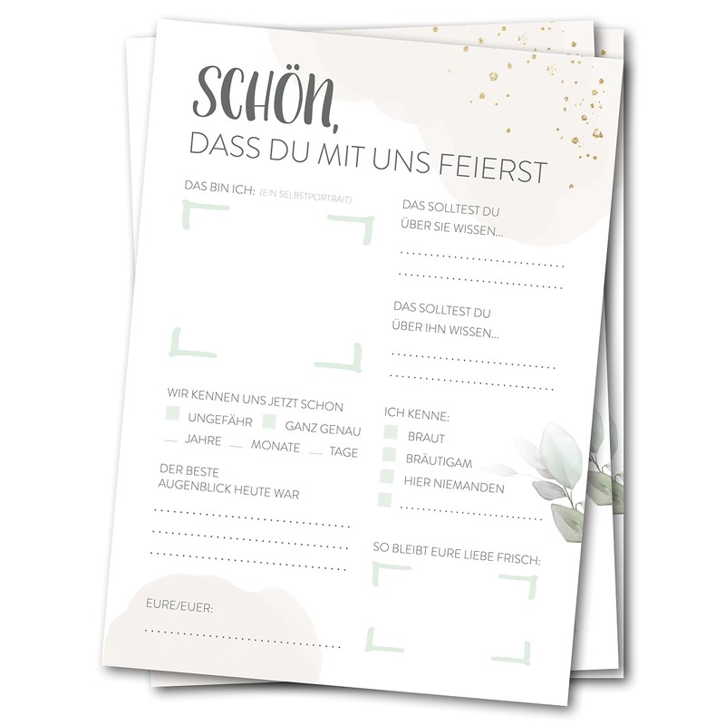 • Easy to use: unlike a free guest book entry, the questions are already defined and it only needs to be filled in. This leads to creative responses from guests. On the back there is room for personal greetings and wishes.