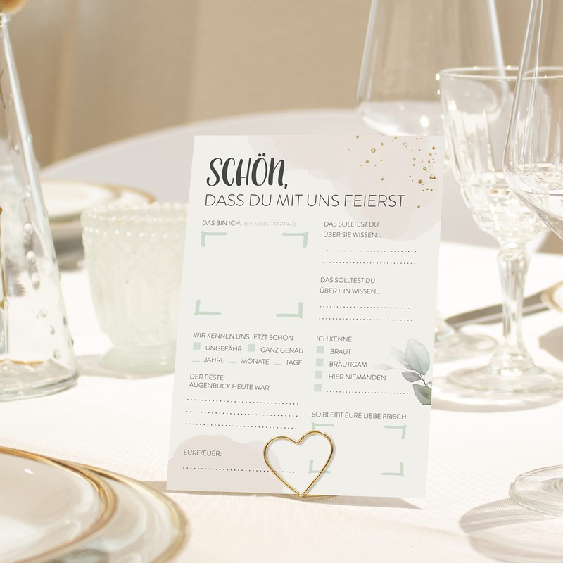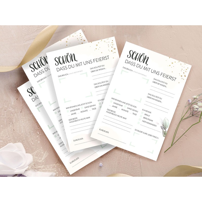 • Easy to use: to loosen up the celebration, to bridge breaks and participate guests. Can also be used as a place card on the squares. Simply enter the name of the guest in "Euer/Eure" - done.
