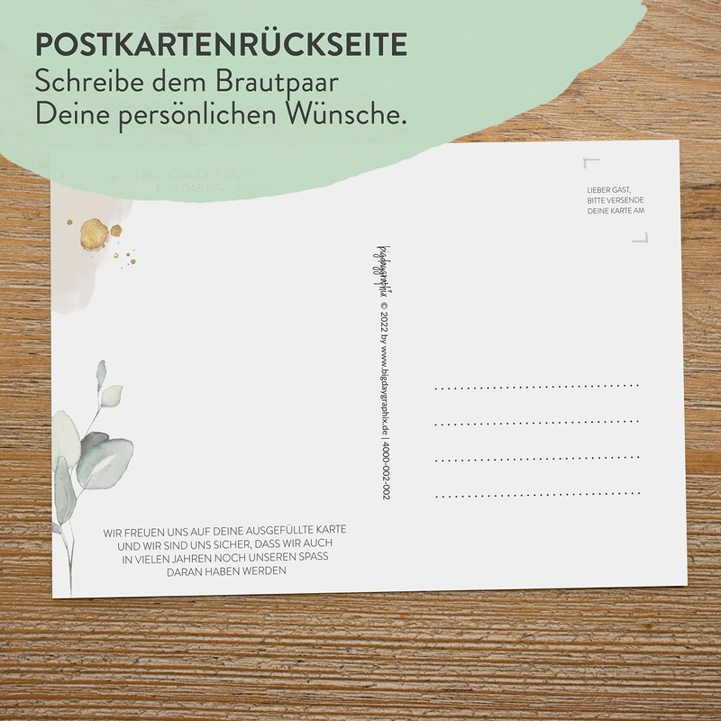 bigdaygraphix Wedding Game - 52 Cards with Questions I Eucalyptus Watercolour Design I Alternative Guest Book I Party Game I Memory Cards I Postcards DIN A6