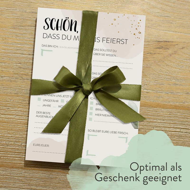 The conventional guest book is too boring for you, or is there already one? No problem - bigdaygraphix offers an alternative: 52 postcards with questions - this wedding game is a great gift for the bride and groom. As an organised wedding game (by the groomsmens?) This set of 52 postcards ensures that the recipient couple receives mail throughout the year.