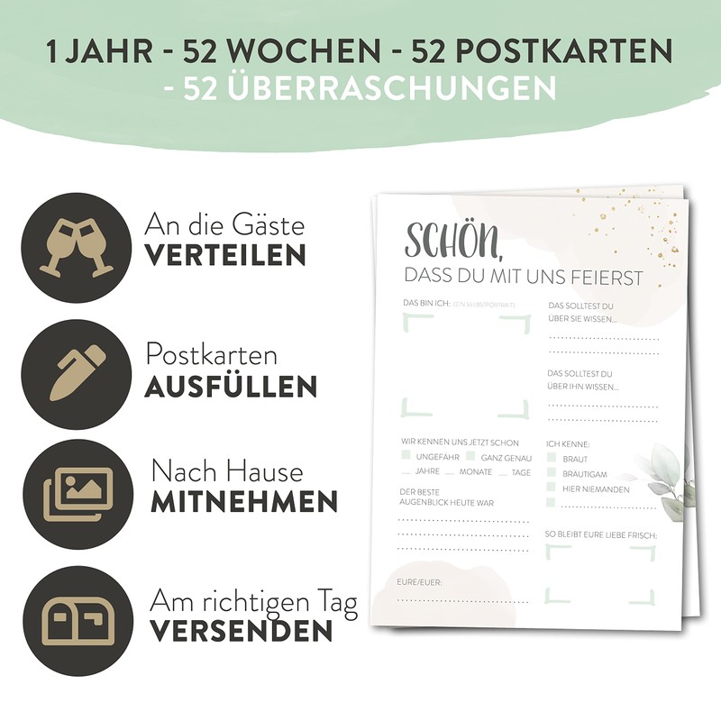 Either the cards are covered on the table or issued during the wedding (by the maid of honour). A beautiful agenda item (e.g. during the photo shoot of the brides) where you can safely talk to each other. On site, the cards can then either be handed over to the organiser, or you set up a mailbox in which the cards are thrown or or... In another variant, the 52 postcards are distributed to the guests and previously labelled with a date by the organiser (there is an extra field for this).