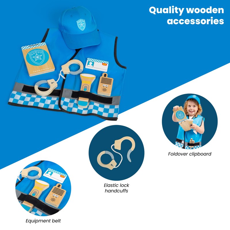- KIDS POLICE COSTUME - Our police pretend play outfit has a blue vest, adjustable baseball cap (48cm-57cm), wooden walkie talkie, ID badge, ID wallet, a torch & hand cuffs; vest is 40.5cm W x 44cm H