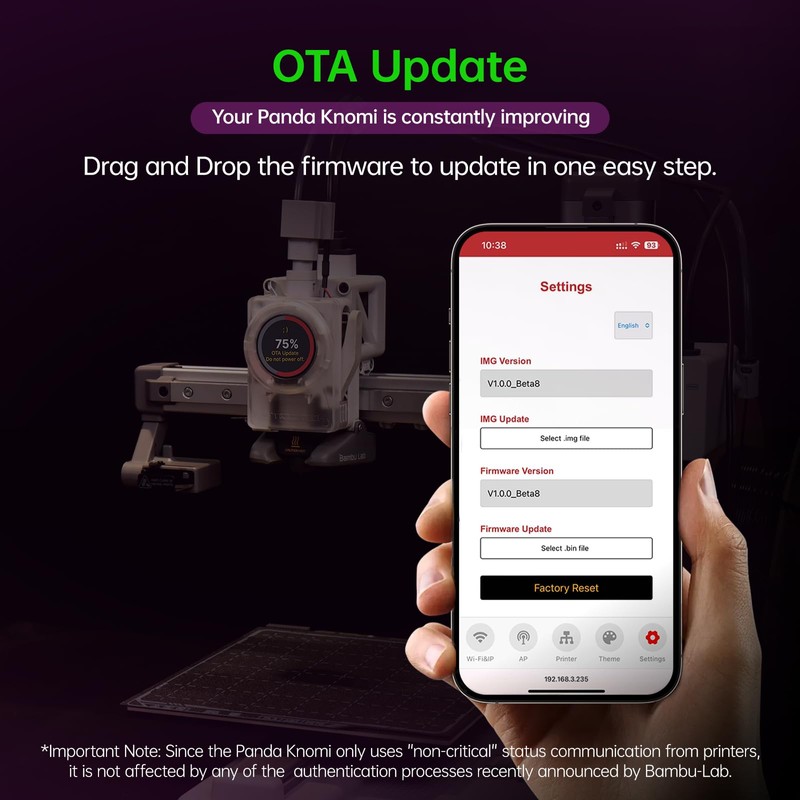 • 【OTA Update】The Panda Knomi screen supports over-the-air updates. Drag and drop the firmware to update your Panda Knomi in one step and watch as your product gets even better over time with more features and improvements. BTT Panda Knomi is not affected by Bambu-Lab’s upcoming firmware and security changes in that it only reads from Bambu-Lab’s network, not control.