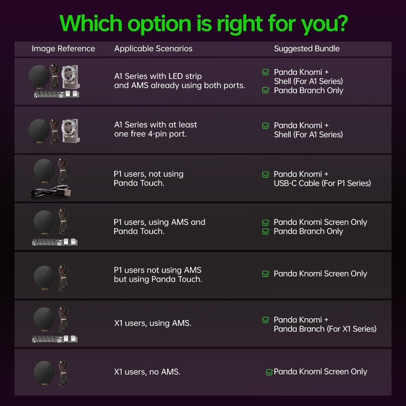 • 【Note】BIGTREETECH Panda Knomi uses the printers’ AMS bus / USB port (on P1P & P1S) for power and data. To retain use of your AMS or AMS Lite, you may need the Panda Branch expansion board to run both simultaneously. For P1P/P1S, you can buy a USB-C cable to power Panda Knomi from the Bambu USB port if you don’t use panda touch. Otherwise, a Panda Branch is still needed.