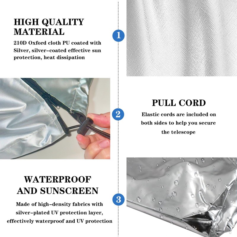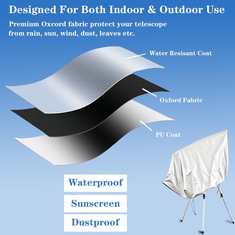 - User friendly design:Double-zipper opening,you can operate the telescope without completely removing the cover,elastic drawstring design at the bottom,close to the telescope to prevent the wind from blowing away,canSecuring the hood firmly to the telescope provides maximum stability even in windy weather