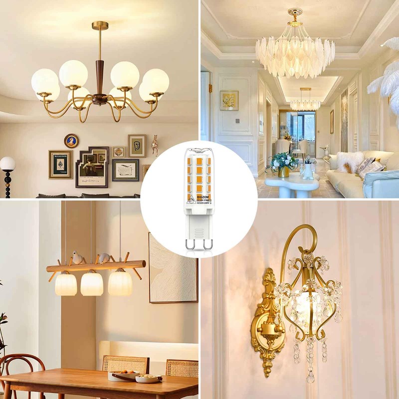 - Wide application: the 4W G9 lamp fits into a standard G9 bi-pin socket and can be used directly in all light installations, such as pendant lights, chandeliers, make-up lights, wall lamps, floor lamps and table lamps.