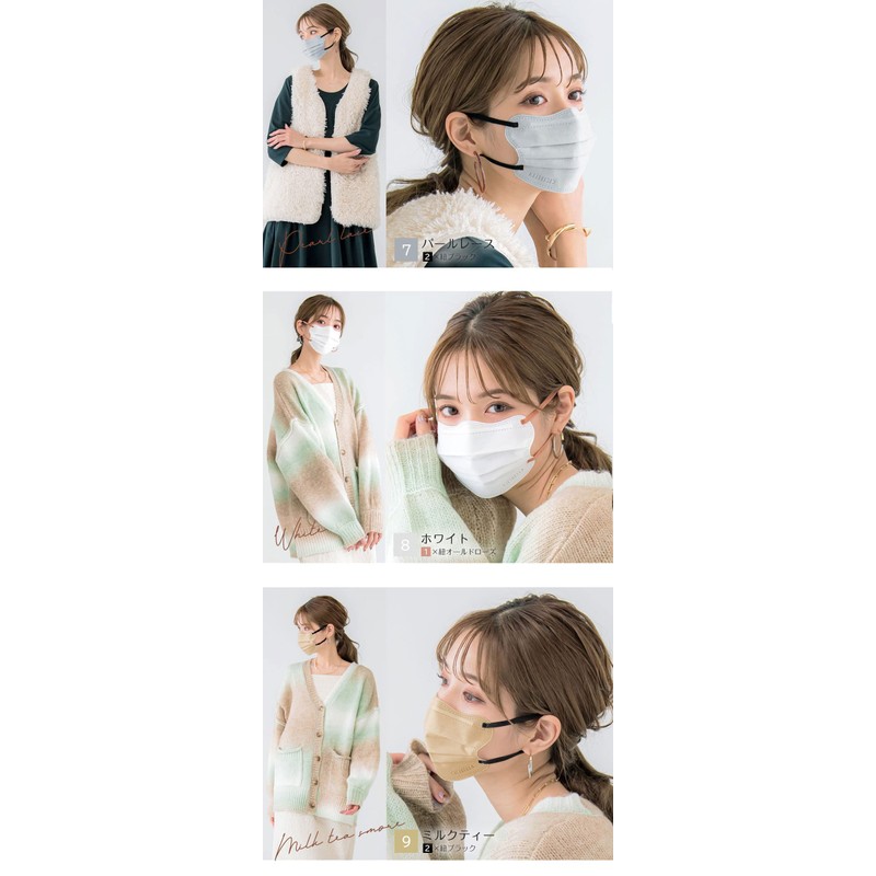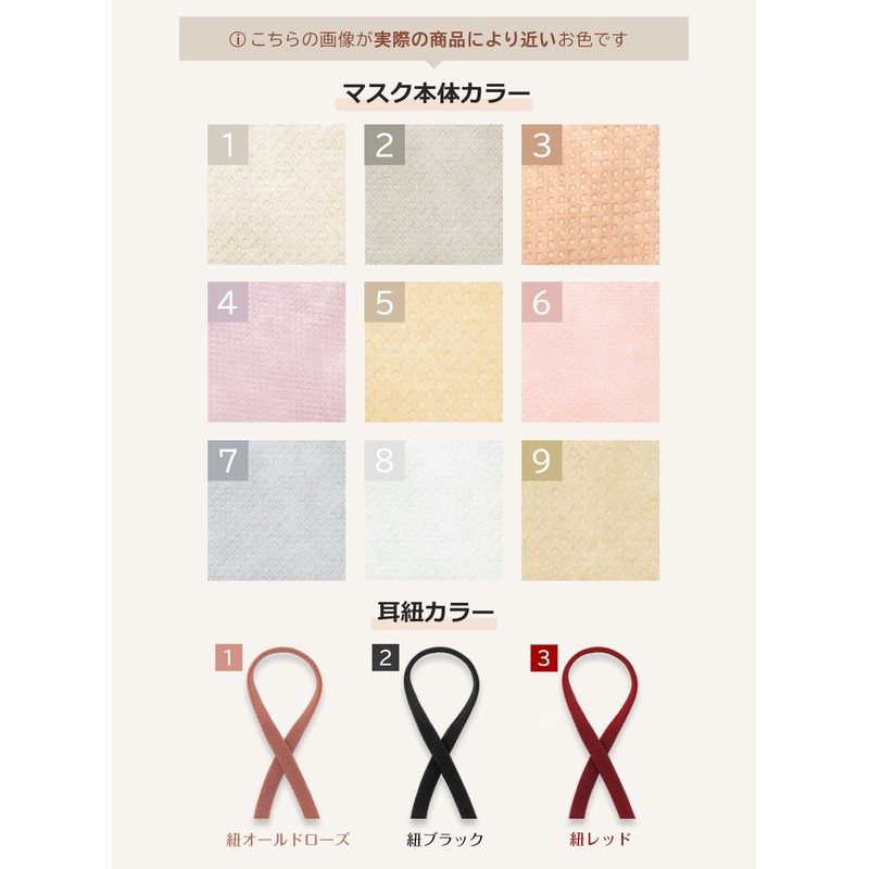 - ■【製品特徴】両面同じ色なのでメイク移りが目立ちにくい仕様。耳が痛くならない、極柔らかゴム紐を採用。長時間つけても気になりません。フィルターは3層構成。不織布と不織布の間にメルトブローン不織布を挟んでおり、99.9%カットを実現。優れた通気性を確保します。